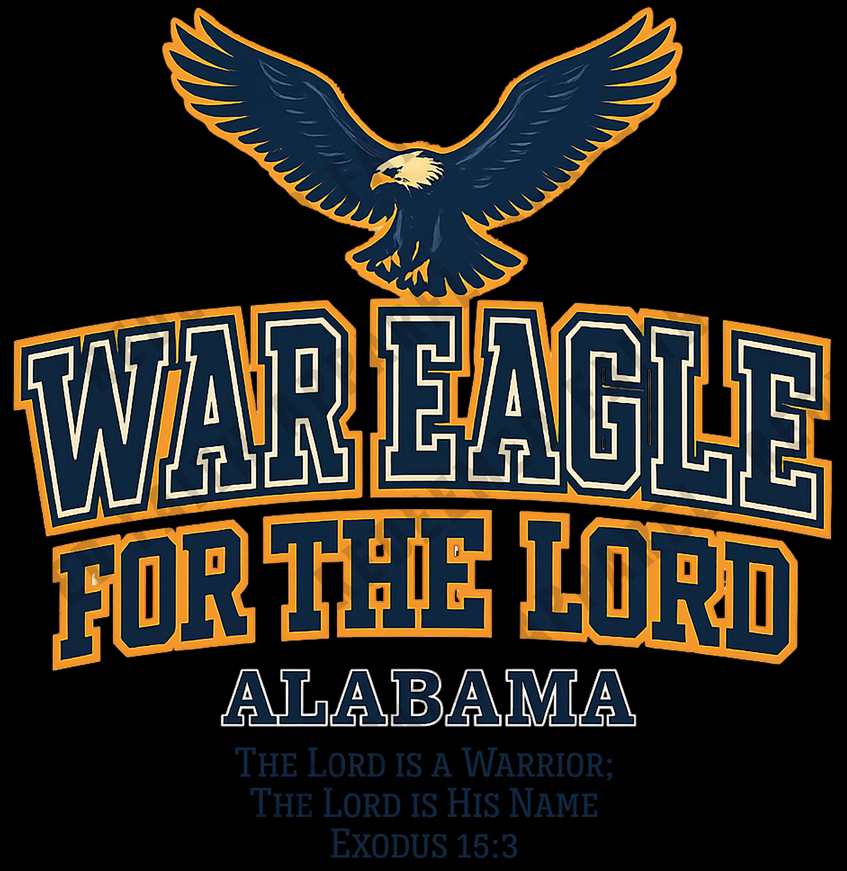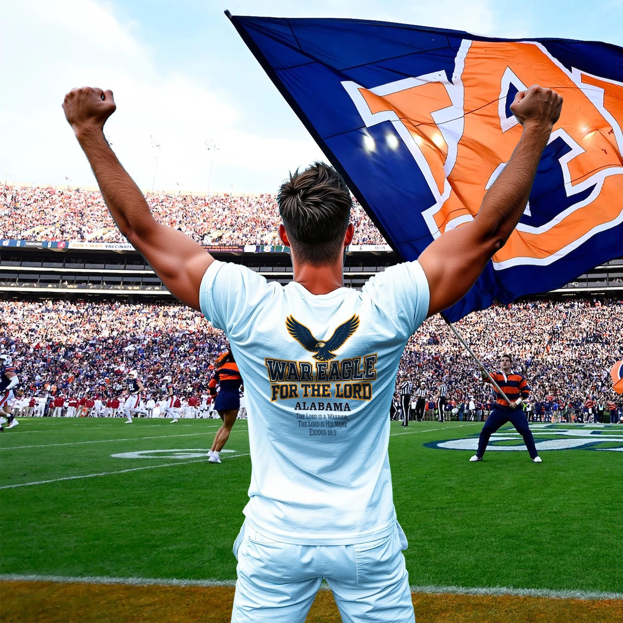 🏈 ✝️ Part of our NEW God Bless America Collection. We will soon have at least 5 Faith-Based T-Shirts for all 50 states. Show your faith and state pride with the “War Eagle for the Lord” Christian T-shirt, where bold Auburn spirit meets unwavering devotion to God. Featuring a powerful eagle soaring above strong collegiate-style lettering, this design declares that the Lord fights our battles and leads us in victory.
