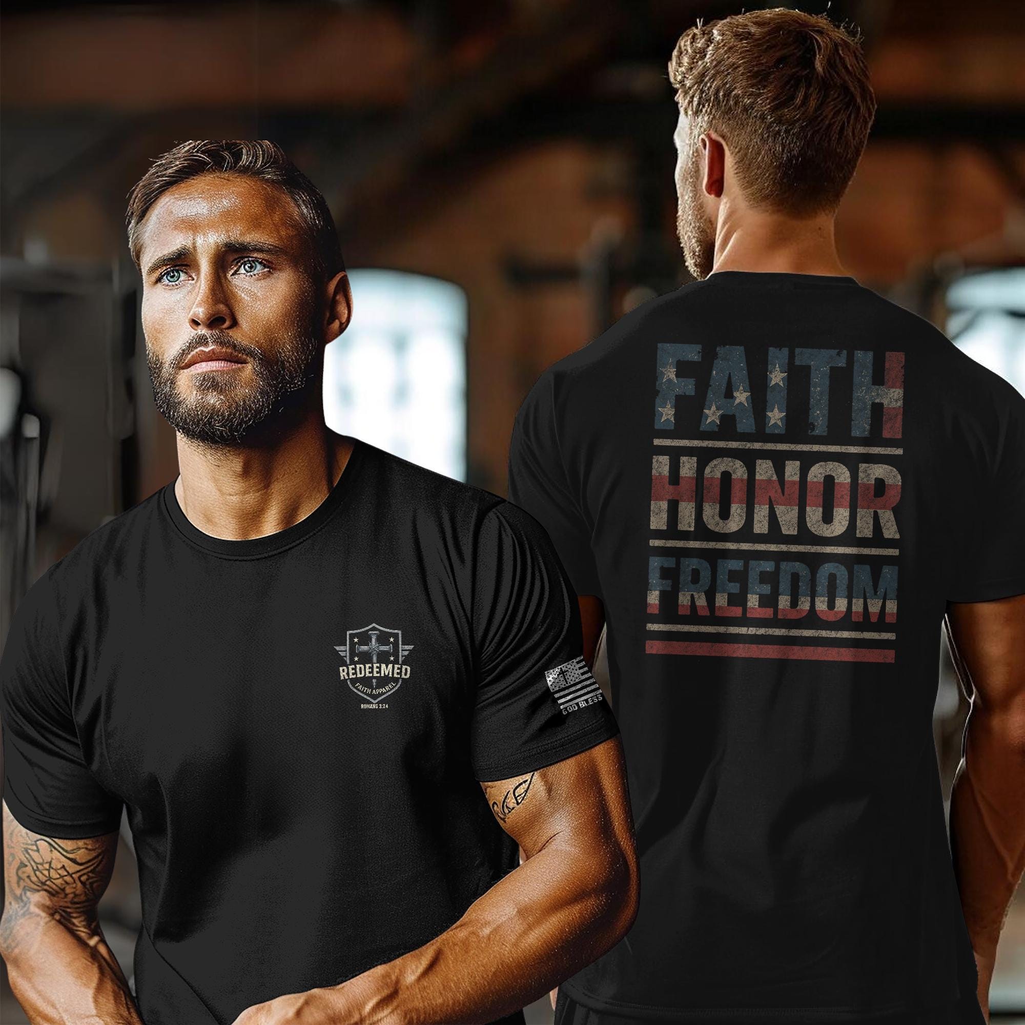 Faith Honor Freedom T-Shirt: Patriotic Christian American Flag Tee
