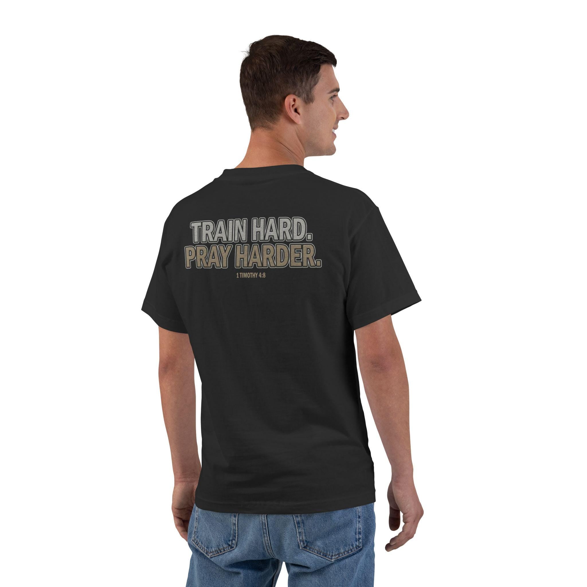 Train Hard Pray Harder Shirt - Christian Fitness T-Shirt, Faith Gym Tee, 1 Timothy 48 Bible Verse Workout Apparel, T-Shirt for Men and Women